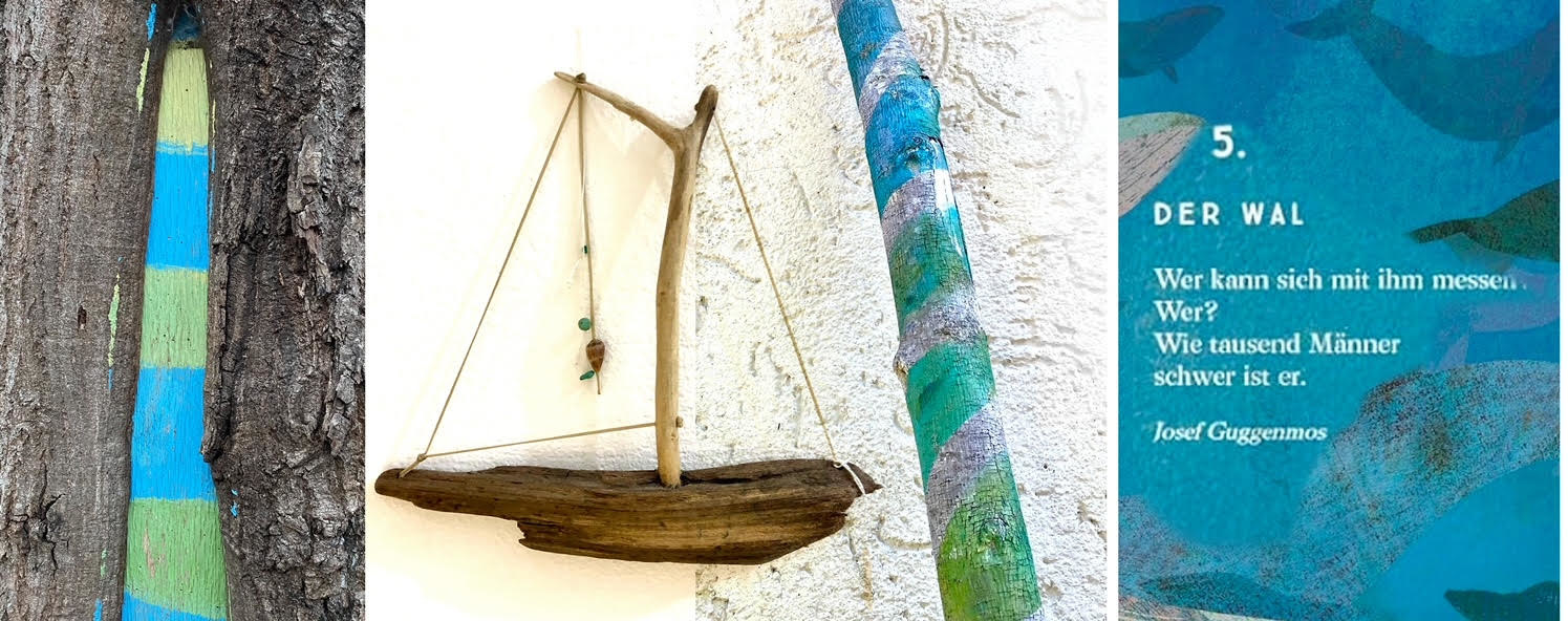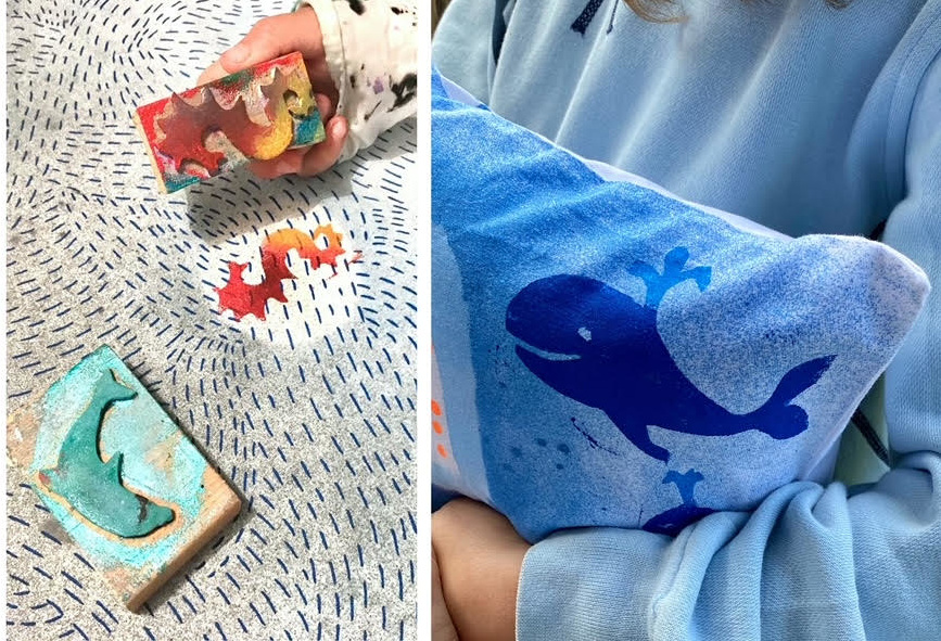 Wir bauen Stempel, besprühen und bedrucken unser Lieblingskopfkissen, bauen Treibholz-Boote und bemalen eine Leinwand zum Thema Unterwasser.